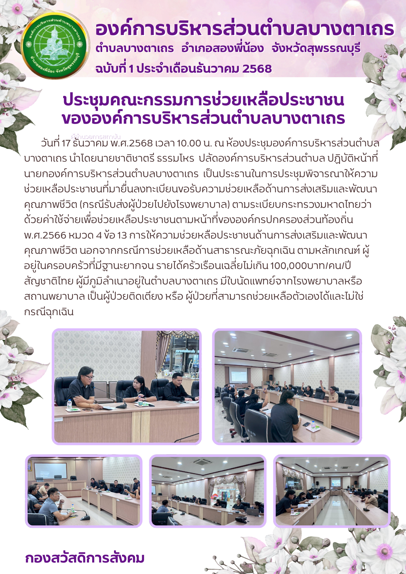 วันที่ 17 ธันวาคม พ.ศ.2568 เวลา 10.00 น. ณ ห้องประชุมองค์การบริหารส่วนตำบลบางตาเถร นำโดยนายชาติชาตรี ธรรมโหร ปลัดองค์การบริหารส่วนตำบล ปฏิบัติหน้าที่ นายกองค์การบริหารส่วนตำบลบางตาเถร เป็นประธานในการประชุมพิจารณาให้ความช่วยเหลือประชาชนที่มายื่นลงทะเบียนขอรับความช่วยเหลือด้านการส่งเสริมและพัฒนาคุณภาพชีวิต (กรณีรับส่งผู้ป่วยไปยังโรงพยาบาล) ตามระเบียบกระทรวงมหาดไทยว่าด้วยค่าใช้จ่ายเพื่อช่วยเหลือประชาชนตามหน้าที่ขององค์กรปกครองส่วนท้องถิ่น พ.ศ.2566 หมวด 4 ข้อ 13 การให้ความช่วยหลือประชาชนด้านการส่งเสริมและพัฒนาคุณภาพชีวิต นอกจากกรณีการช่วยเหลือด้านสาธารณะภัยฉุกเฉิน ตามหลักเกณฑ์ ผู้อยู่ในครอบครัวที่มีฐานะยากจน รายได้ครัวเรือนเฉลี่ยไม่เกิน 100,000บาท/คน/ปี สัญชาติไทย ผู้มีภูมิลำเนาอยู่ในตำบลบางตาเถร มีใบนัดแพทย์จากโรงพยาบาลหรือสถานพยาบาล เป็นผู้ป่วยติดเตียง หรือ ผู้ป่วยที่สามารถช่วยเหลือตัวเองได้และไม่ใช่กรณีฉุกเฉิน