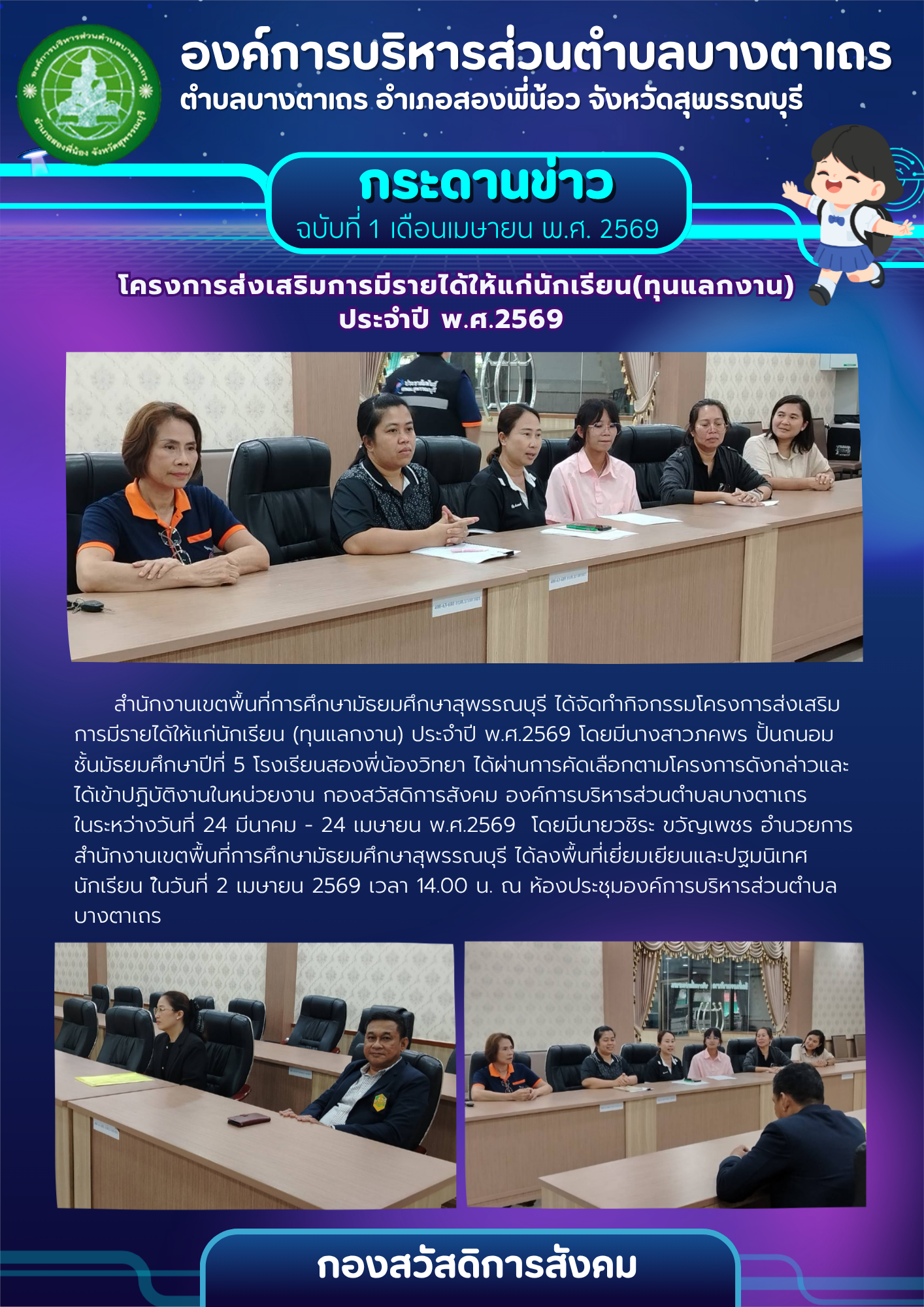 สำนักงานเขตพื้นที่การศึกษามัธยมศึกษาสุพรรณบุรี ได้จัดทำกิจกรรมโครงการส่งเสริมการมีรายได้ให้แก่นักเรียน (ทุนแลกงาน) ประจำปี พ.ศ.2569 โดยมีนางสาวภคพร ปั้นถนอม ชั้นมัธยมศึกษาปีที่ 5 โรงเรียนสองพี่น้องวิทยา ได้ผ่านการคัดเลือกตามโครงการดังกล่าวและได้เข้าปฏิบัติงานในหน่วยงาน กองสวัสดิการสังคม องค์การบริหารส่วนตำบลบางตาเถร ในระหว่างวันที่ 24 มีนาคม - 24 เมษายน พ.ศ.2569 โดยมีนายวชิระ ขวัญเพชร อำนวยการสำนักงานเขตพื้นที่การศึกษามัธยมศึกษาสุพรรณบุรี ได้ลงพื้นที่เยี่ยมเยียนและปฐมนิเทศนักเรียน ใันวันที่ 2 เมษายน 2569 เวลา 14.00 น. ณ ห้องประชุมองค์การบริหารส่วนตำบลบางตาเถร