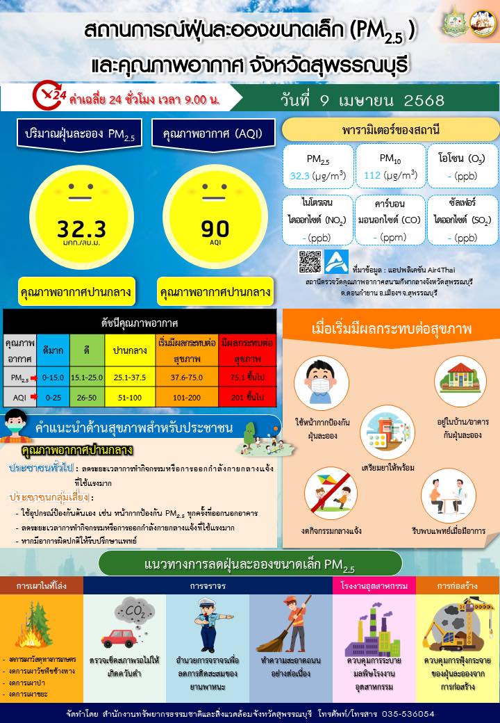 📢 สถานการณ์ฝุ่นละอองขนาดเล็ก (PM2.5) และคุณภาพอากาศ จังหวัดสุพรรณบุรี |