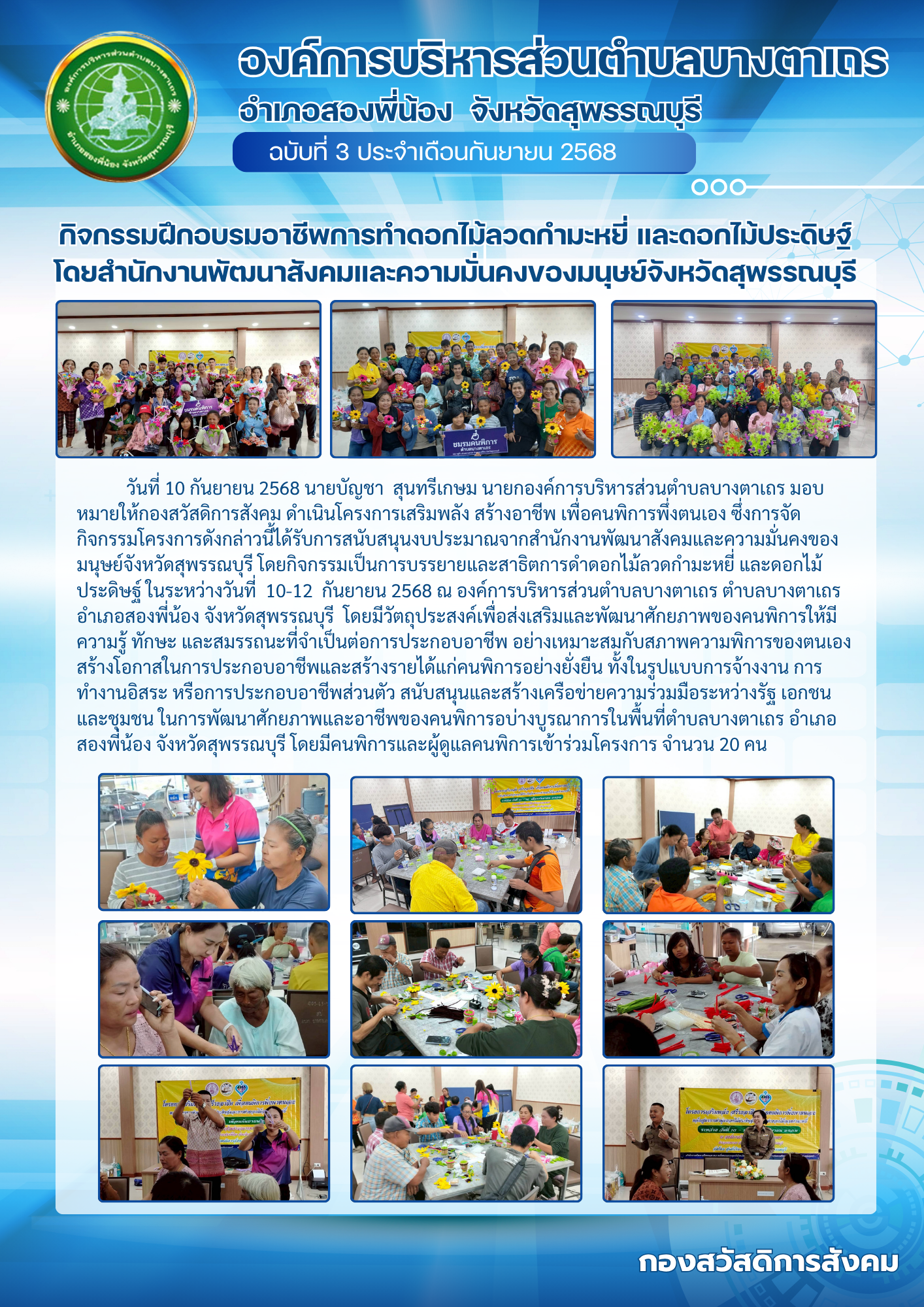 วันที่ 10 - 12 กันยายน 2568 นายบัญชา สุนทรีเกษม นายกองค์การบริหารส่วนตำบลบางตาเถร มอบหมายให้กองสวัสดิการสังคม ดำเนินโครงการเสริมพลัง สร้างอาชีพ เพื่อคนพิการพึ่งตนเอง ซึ่งการจัดกิจกรรมโครงการดังกล่าวนี้ได้รับการสนับสนุนงบประมาณจากสำนักงานพัฒนาสังคมและความมั่นคงของมนุษย์จังหวัดสุพรรณบุรี โดยกิจกรรมเป็นการบรรยายและสาธิตการดำดอกไม้ลวดกำมะหยี่ และดอกไม้ประดิษฐ์ ในระหว่างวันที่ 10-12 กันยายน 2568 ณ องค์การบริหารส่วนตำบลบางตาเถร ตำบลบางตาเถร อำเภอสองพี่น้อง จังหวัดสุพรรณบุรี โดยมีวัตถุประสงค์เพื่อส่งเสริมและพัฒนาศักยภาพของคนพิการให้มีความรู้ ทักษะ และสมรรถนะที่จำเป็นต่อการประกอบอาชีพ อย่างเหมาะสมกับสภาพความพิการของตนเอง สร้างโอกาสในการประกอบอาชีพและสร้างรายได้แก่คนพิการอย่างยั่งยืน ทั้งในรูปแบบการจ้างงาน การทำงานอิสระ หรือการประกอบอาชีพส่วนตัว สนับสนุนและสร้างเครือข่ายความร่วมมือระหว่างรัฐ เอกชน และชุมชน ในการพัฒนาศักยภาพและอาชีพของคนพิการอบ่างบูรณาการในพื้นที่ตำบลบางตาเถร อำเภอสองพี่น้อง จังหวัดสุพรรณบุรี โดยมีคนพิการและผู้ดูแลคนพิการเข้าร่วมโครงการ จำนวน 20 คน