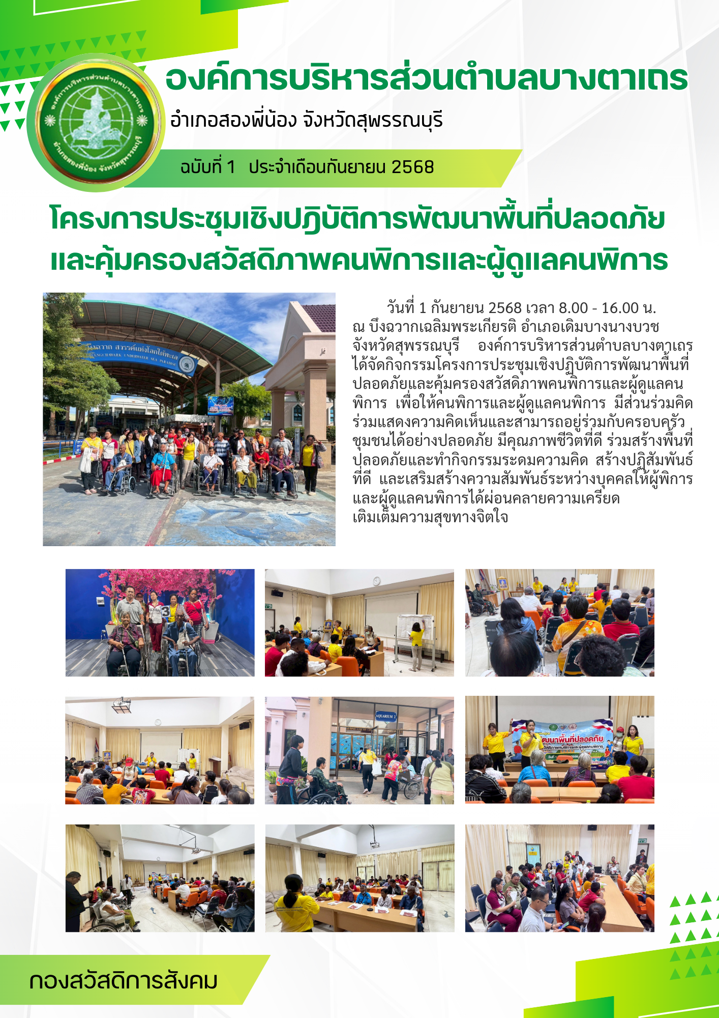 วันที่ 1 กันยายน 2568 เวลา 8.00 - 16.00 น. ณ บึงฉวากเฉลิมพระเกียรติ อำเภอเดิมบางนางบวช จังหวัดสุพรรณบุรี องค์การบริหารส่วนตำบลบางตาเถรได้จัดกิจกรรมโครงการประชุมเชิงปฏิบัติการพัฒนาพื้นที่ปลอดภัยและคุ้มครองสวัสดิภาพคนพิการและผู้ดูแลคนพิการ เพื่อให้คนพิการและผู้ดูแลคนพิการ มีส่วนร่วมคิด ร่วมแสดงความคิดเห็นและสามารถอยู่ร่วมกับครอบครัว ชุมชนได้อย่างปลอดภัย มีคุณภาพชีวิตที่ดี ร่วมสร้างพื้นที่ปลอดภัยและทำกิจกรรมระดมความคิด สร้างปฏิสัมพันธ์ที่ดี และเสริมสร้างความสัมพันธ์ระหว่างบุคคลให้ผู้พิการและผู้ดูแลคนพิการได้ผ่อนคลายความเครียด เติมเต็มความสุขทางจิตใจ